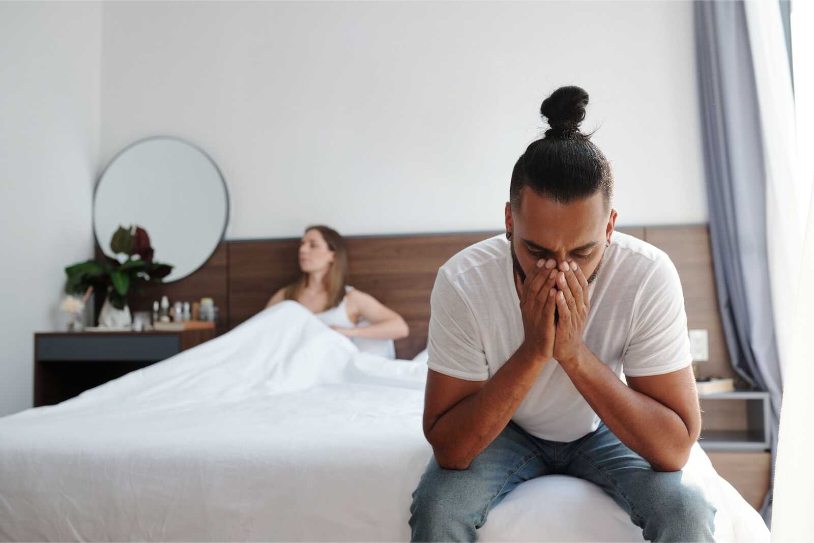 Couple experiencing emotional distance in bedroom, highlighting need for marriage counseling for sexless marriage